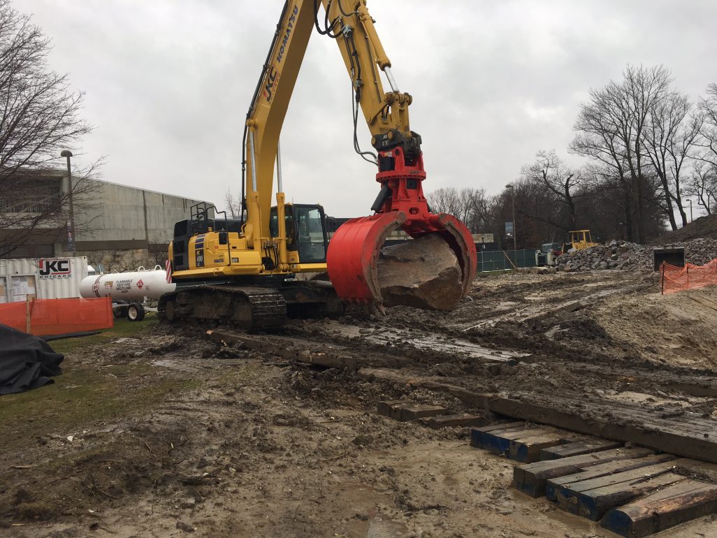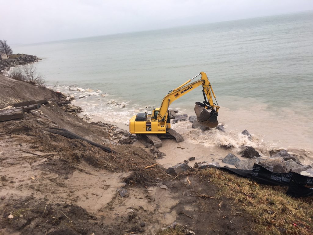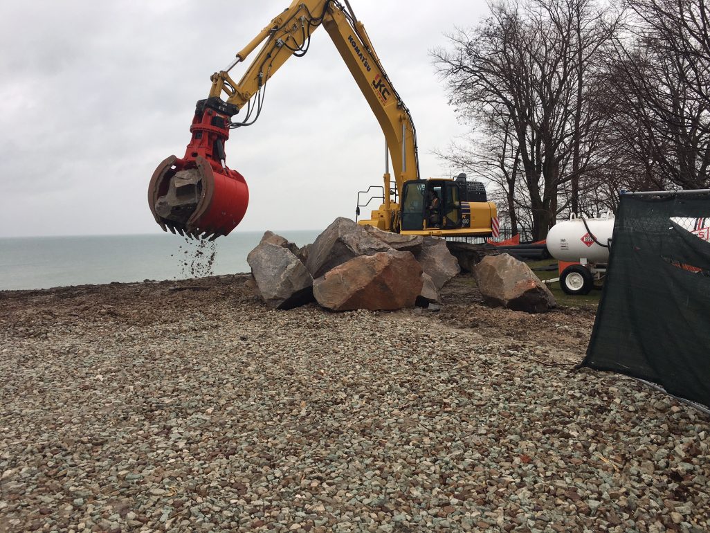 Operators working for John Keno & Company Inc. position boulders along the Lake Michigan shoreline on April 4 at Carthage College in Kenosha. 139er Greg Smith is running the excavator with a clam attachment on top of the bluff. Their employer is based in Chicago.