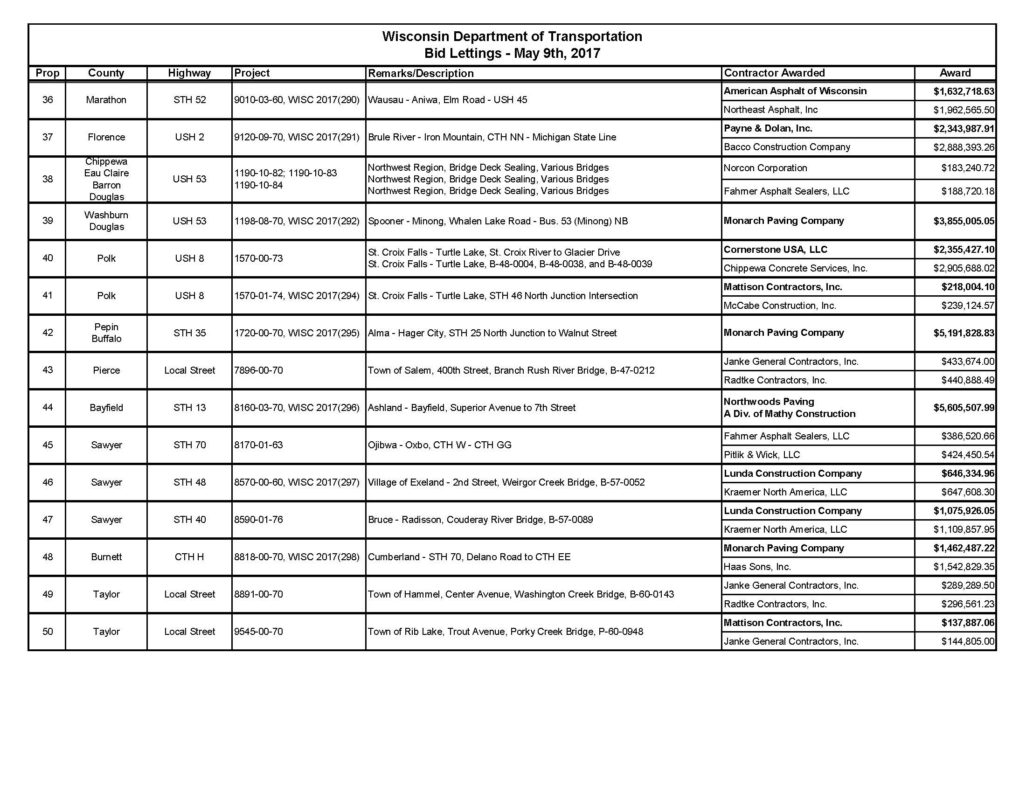 WI DOT Bid Lettings – May 9th, 2017 Posted on May 11, 2017 by Becky Laumann - DOT Bid Lettings, Member News, Projects Download the PDF File below: DOT Bid Lettings – 5.9.17