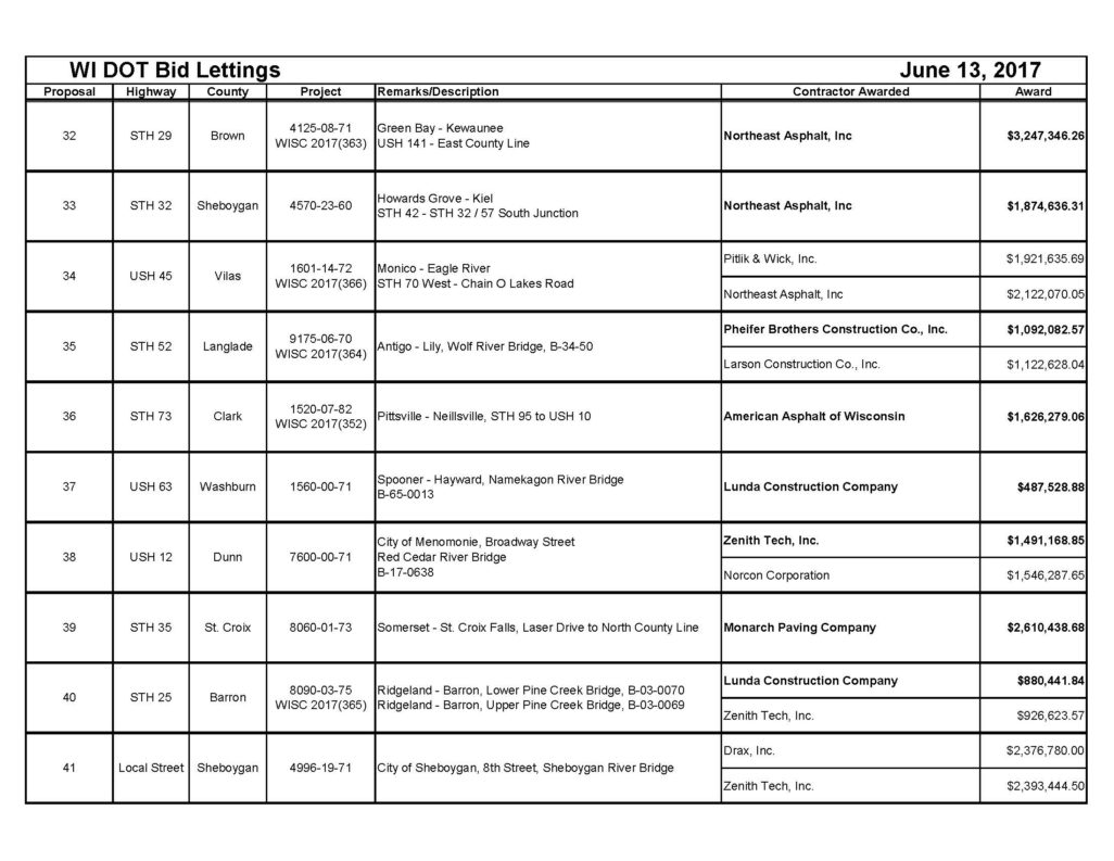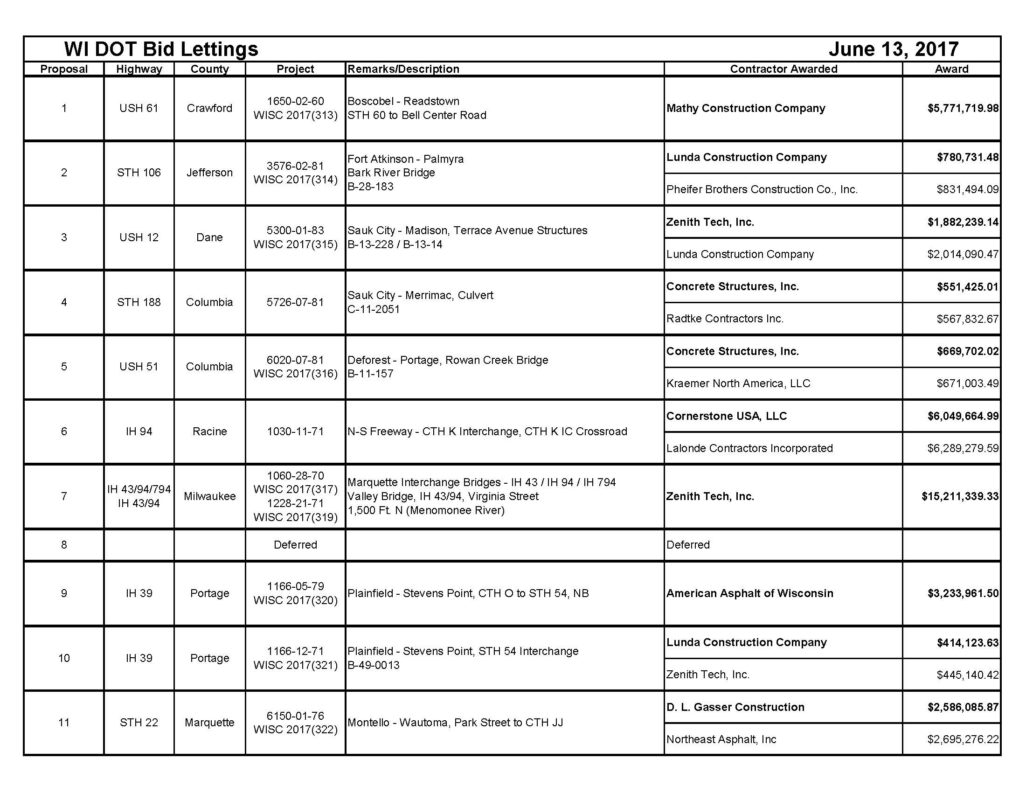 WI DOT Bid Lettings – June 13th, 2017 Posted on June 13, 2017 by Becky Laumann - DOT Bid Lettings, Member News, Projects Download the PDF File below: DOT Bid Lettings – 6.13.17