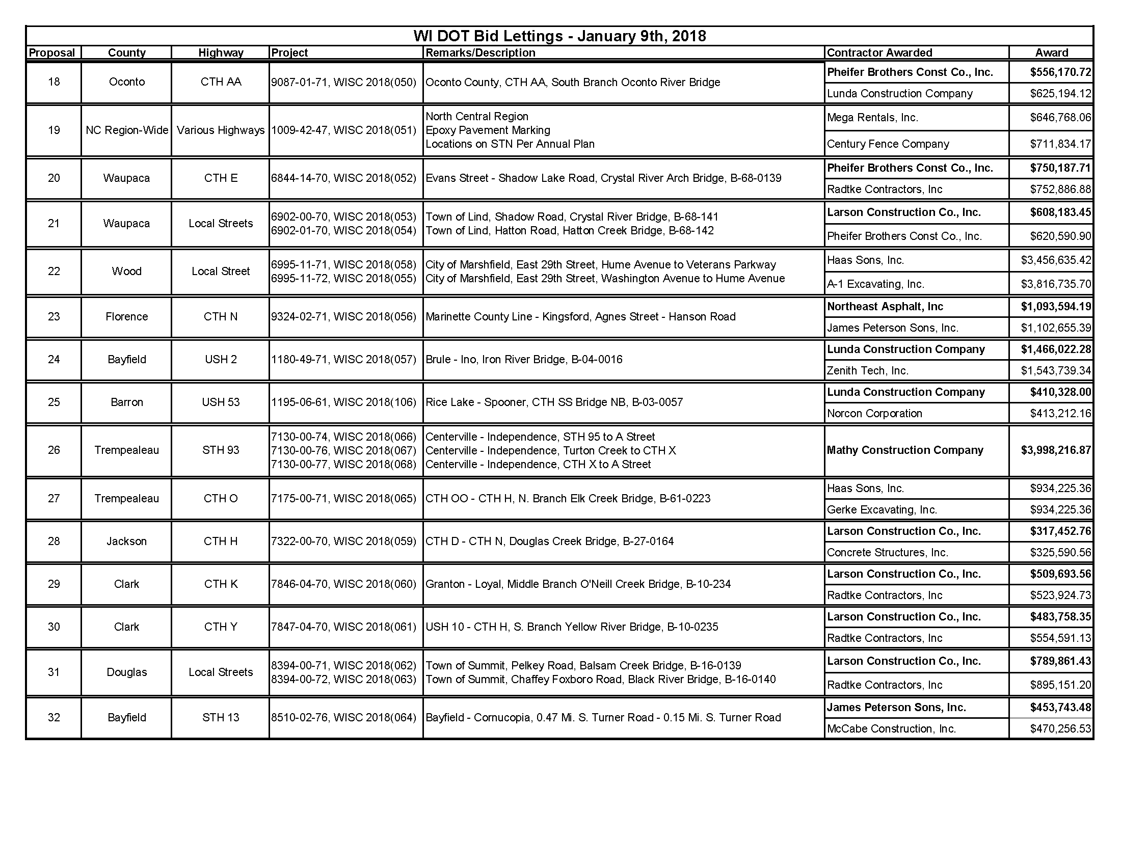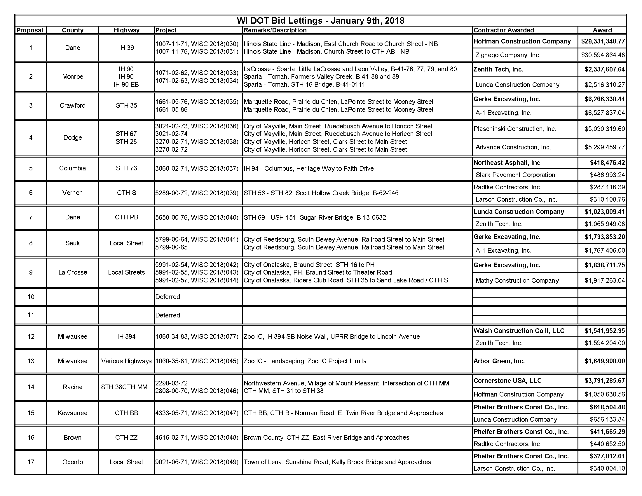 WI DOT Bid Lettings – January 9, 2018 Posted on January 9, 2018 by Becky Laumann - DOT Bid Lettings, Member News, Projects, Transportation Download the PDF Version below: DOT Bid Lettings – 1.9.18