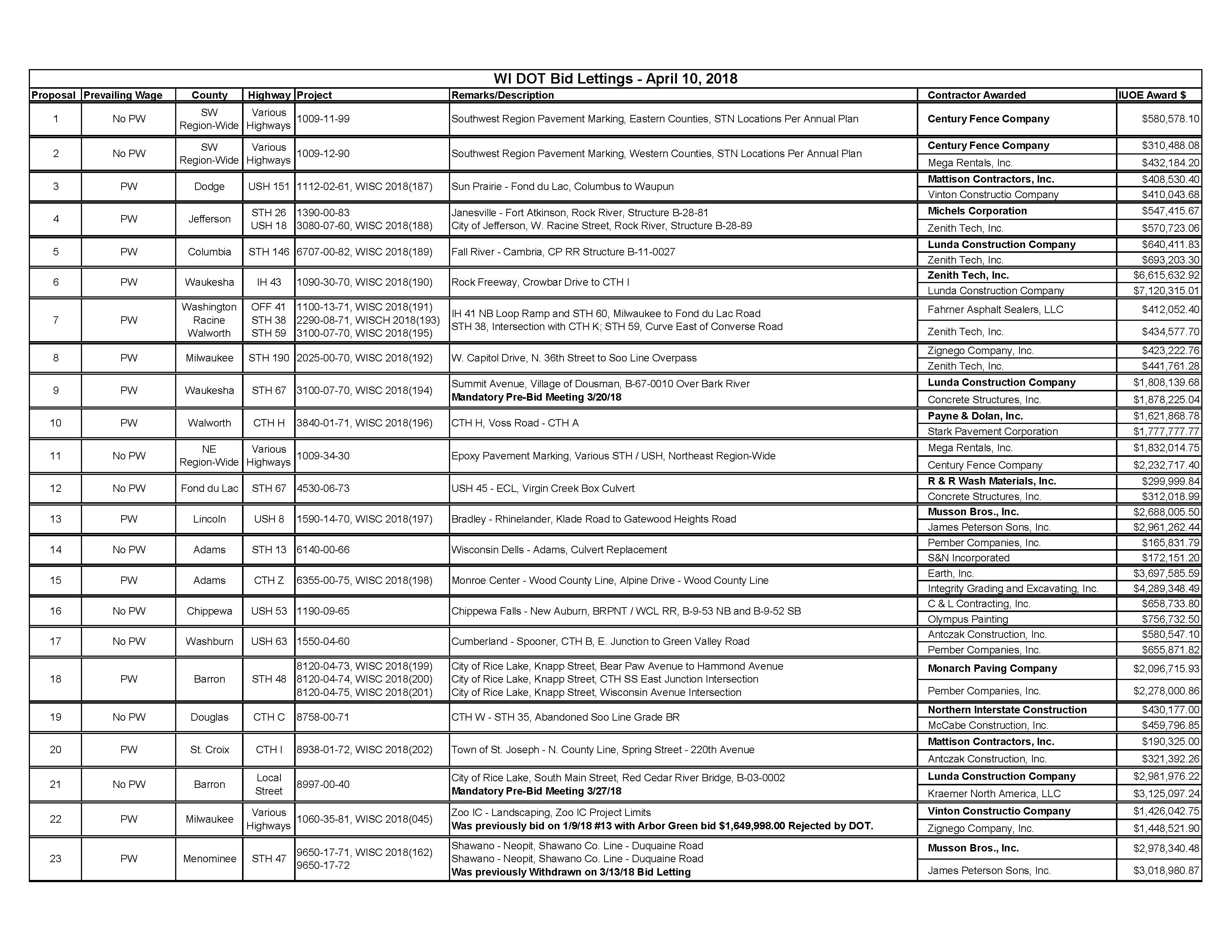 WI DOT Bid Lettings – April 10, 2018 Posted on April 10, 2018 by Becky Laumann - DOT Bid Lettings, Transportation Click Here To Download the PDF Version: DOT Bid Lettings – 4.10.18