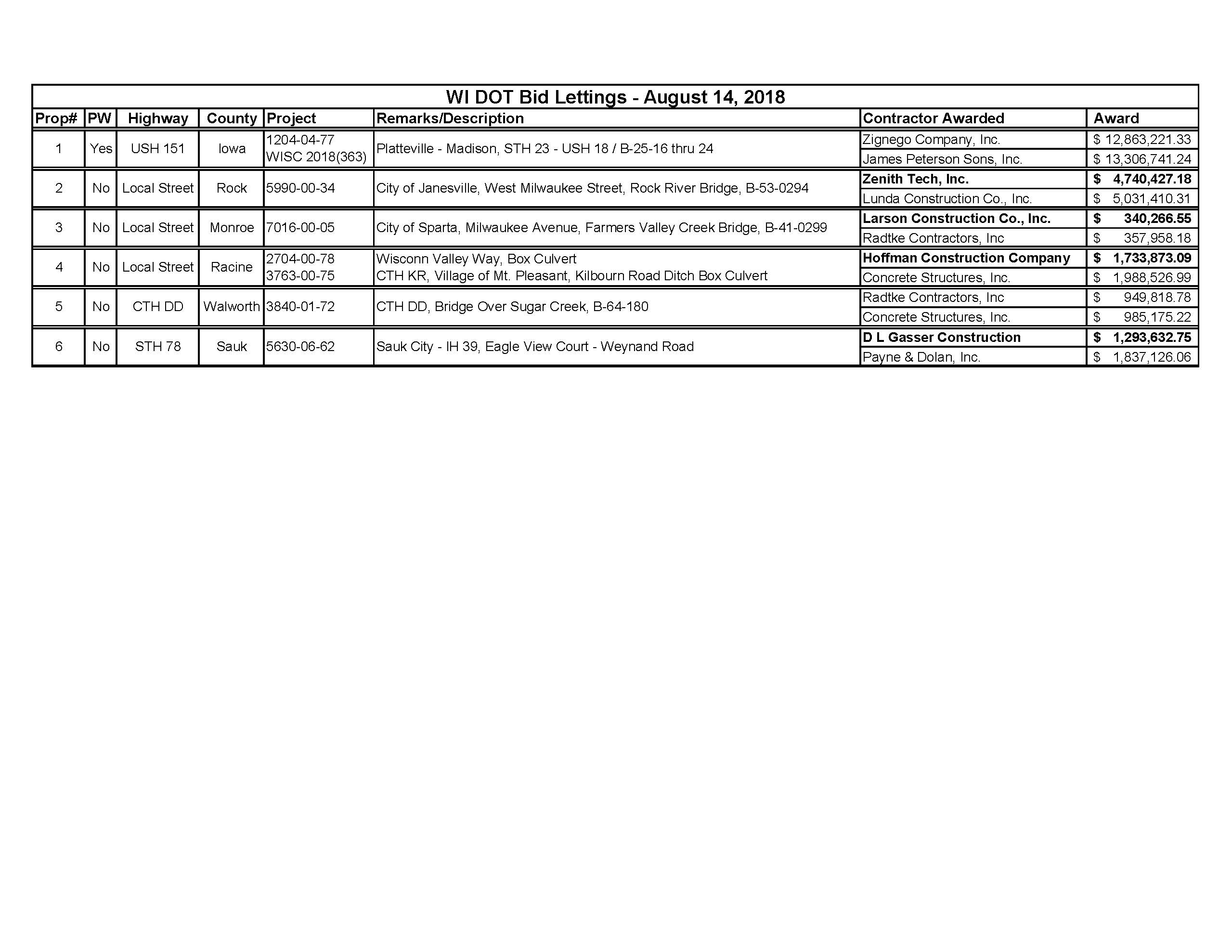 WI DOT Bid Lettings – August 14, 2018 Posted on August 14, 2018 by Becky Laumann - DOT Bid Lettings, Member News, News, Transportation Click Here To Download the PDF Version: DOT Bid Lettings – 8.14.18