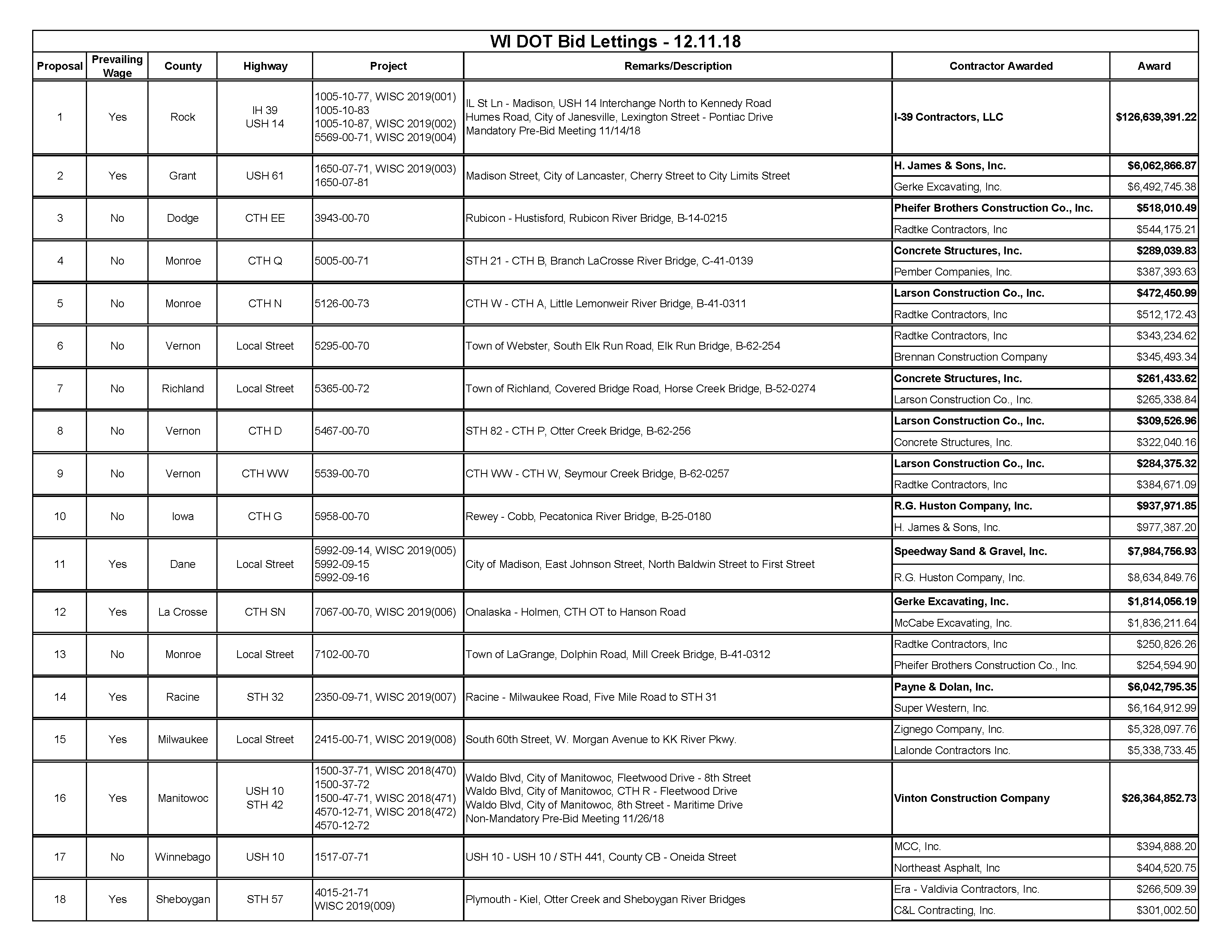 WI DOT Bid Lettings – December 11, 2018 Posted on December 11, 2018 by Becky Laumann - DOT Bid Lettings, Member News, Projects, Transportation Click Here To Download the PDF Version: DOT Bid Lettings – 12.11.18