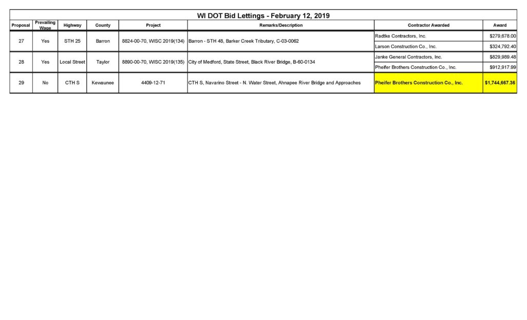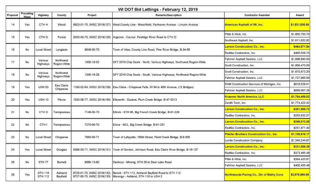 WI DOT Bid Lettings – February 12, 2019 Posted on February 12, 2019 by Becky Laumann - DOT Bid Lettings, Member News, Projects, Transportation Download the PDF: DOT Bid Lettings – 2.12.19Download