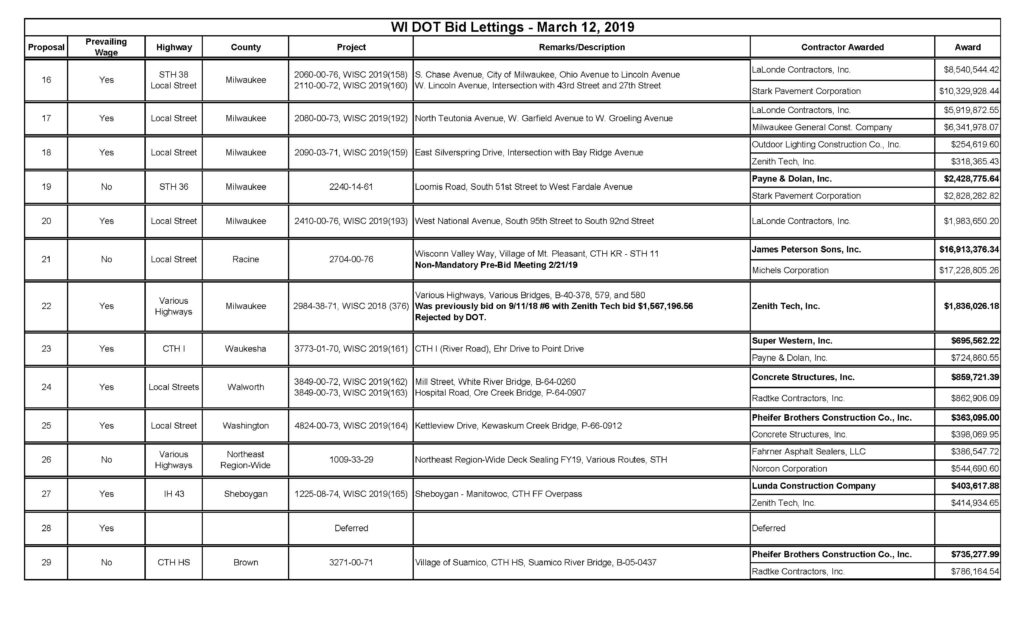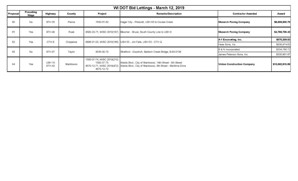 WI DOT Bid Lettings – March 12, 2019 Posted on March 13, 2019 by Becky Laumann - DOT Bid Lettings, Member News, News, Transportation Download PDF File:DOT Bid Lettings – 3.12.19Download
