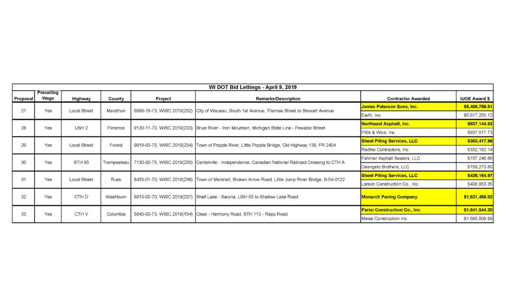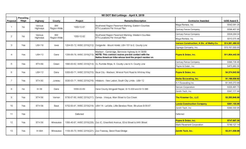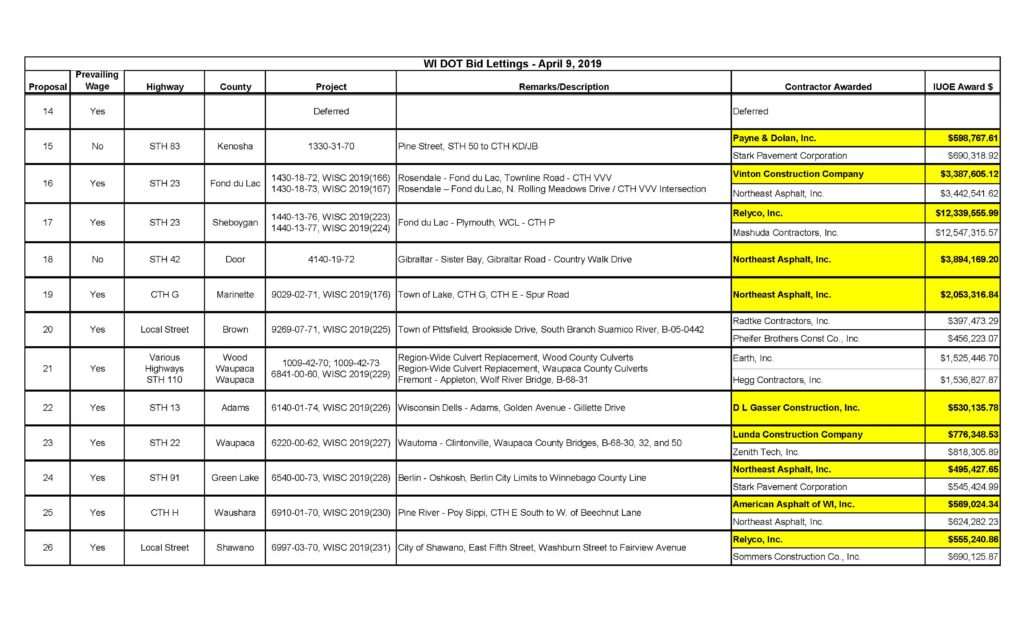 WI DOT Bid Lettings – April 9, 2019 Posted on April 11, 2019 by Becky Laumann - DOT Bid Lettings, Member News, News, Projects, Transportation Downloadable PDF:DOT Bid Lettings – 4.9.19Download