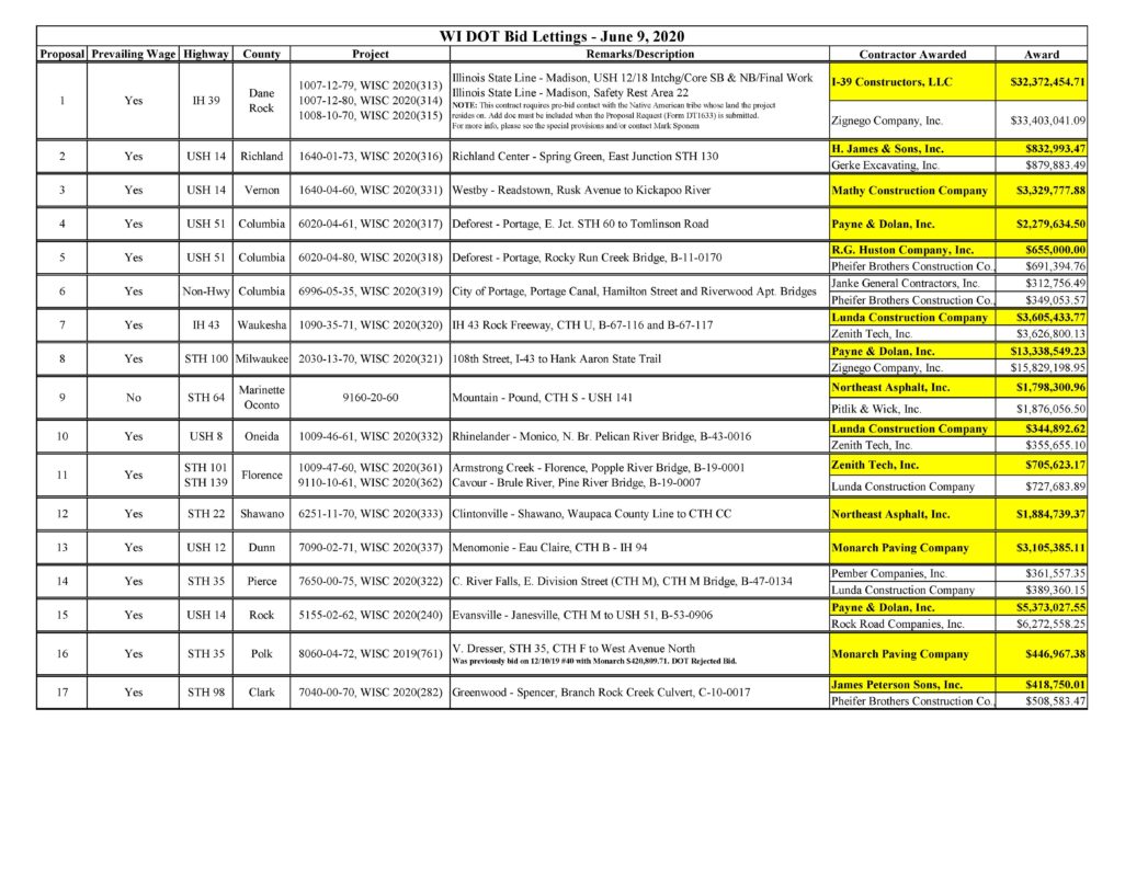 WI DOT Bid Lettings – June 9, 2020 Posted on June 9, 2020 by Becky Laumann - DOT Bid Lettings, Member News, News, Projects, Transportation To Download PDF:DOT-Bid-Lettings-6.9.2020Download
