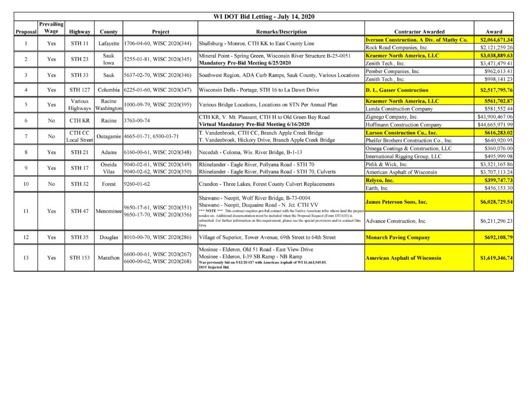 WI DOT Bid Lettings – July 14, 2020 Posted on July 15, 2020 by Becky Laumann - DOT Bid Lettings, Member News, News, Projects, Transportation To Download PDF:DOT-Bid-Lettings-7.14.2020Download