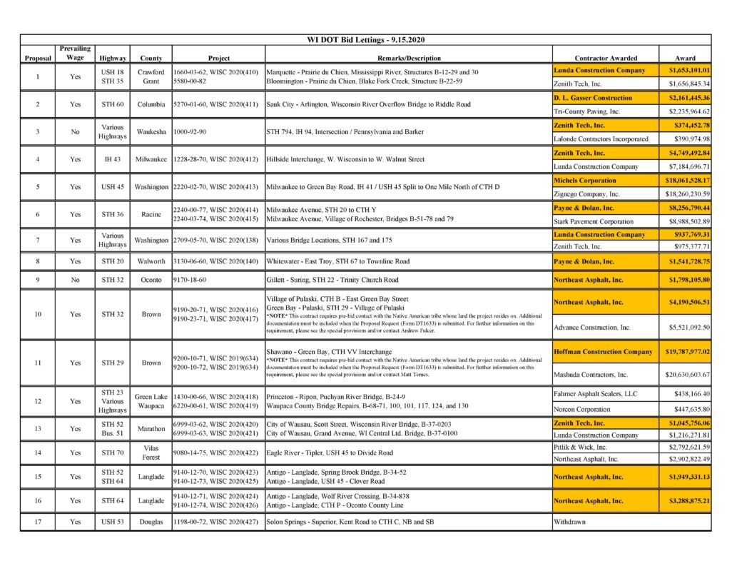 WI DOT Bid Lettings – September 15, 2020 Posted on September 15, 2020 by Becky Laumann - DOT Bid Lettings, Member News, News, Projects, Transportation To Download PDF:DOT-Bid-Lettings-9.15.2020Download