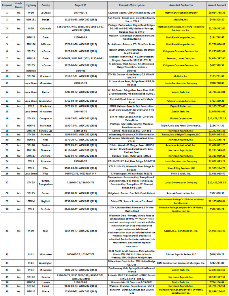 WI DOT Bid Lettings – May 11, 2021 Posted on May 12, 2021 by Local 139 - DOT Bid Lettings DOWNLOAD BID LETTINGS