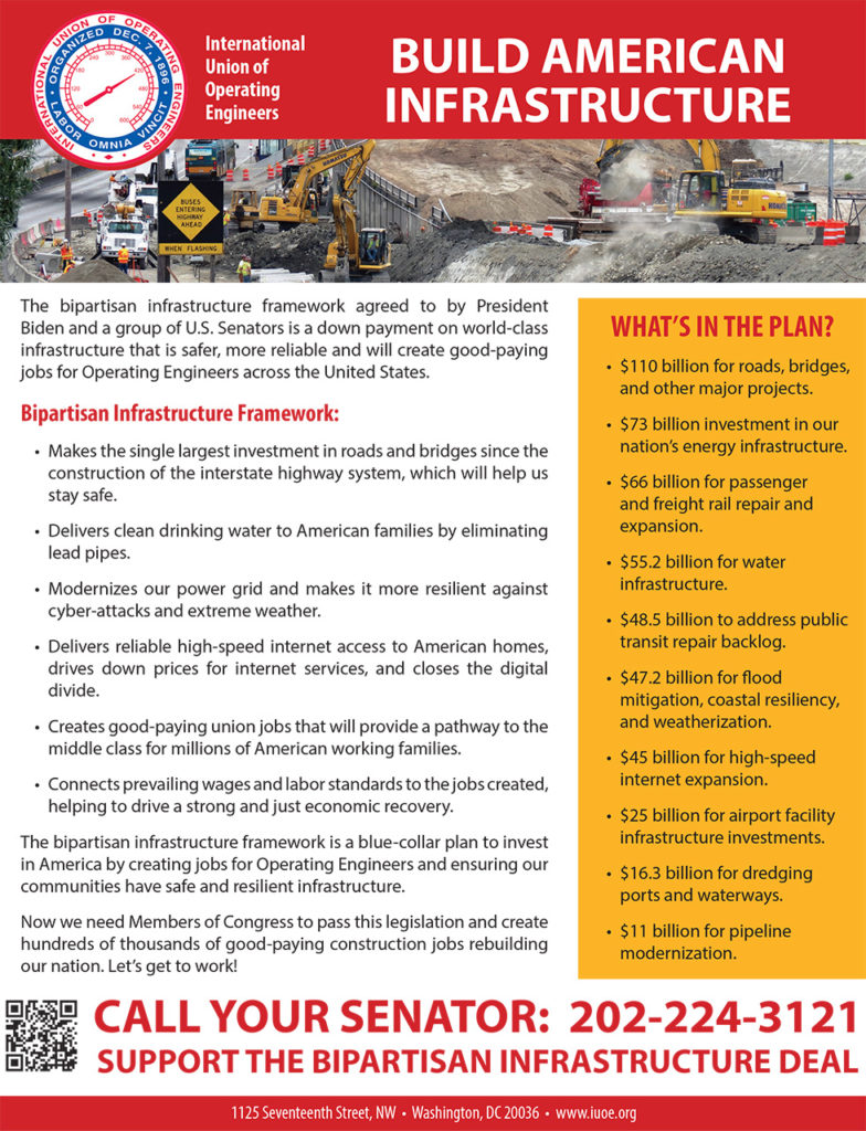 The bipartisan infrastructure framework is a down payment on world-class infrastructure that is safer, more reliable, and will create good-paying jobs for Operating Engineers across the United States. Learn More >>