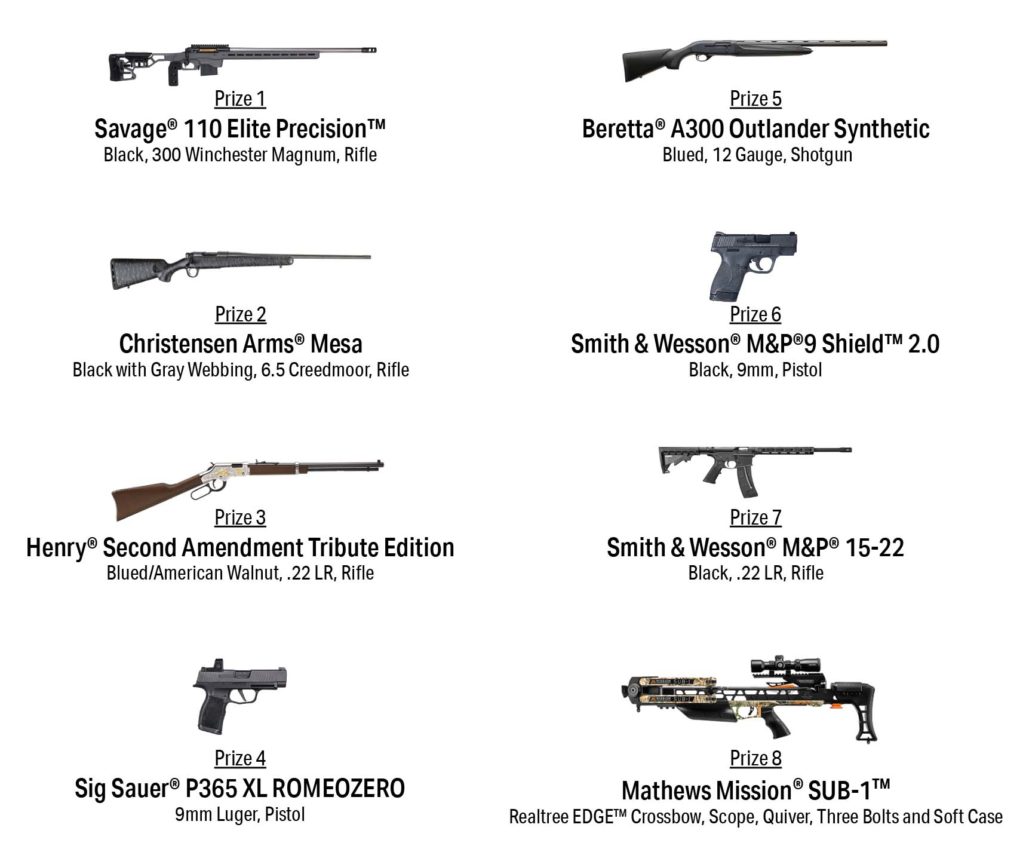 - Winners who fail to redeem their prize voucher by July 31, 2022, or who fail to comply and/or satisfy any and/or all federal and/or state requirements(s) to legally obtain, own, possess and/or acquire said firearm shall forfeit their prize and no substitute prize(s) or additional drawing(s) will be awarded or held.