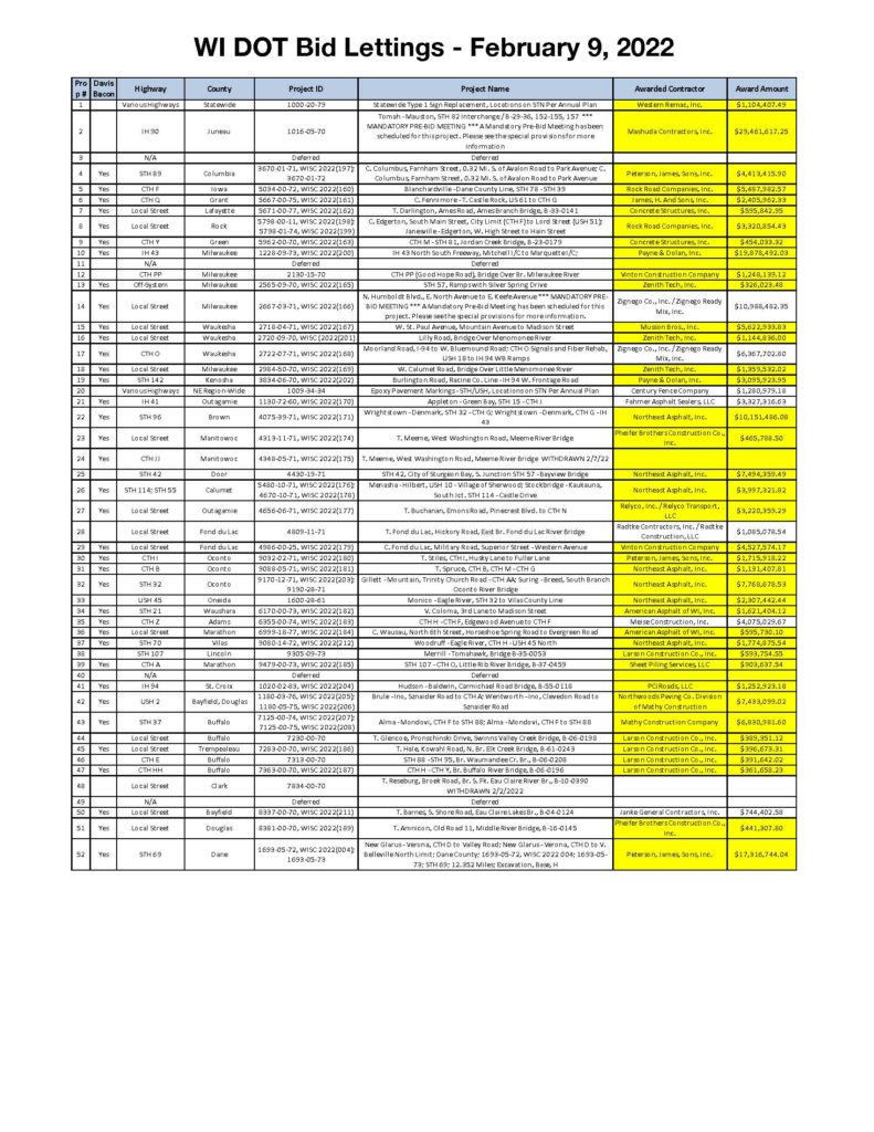 WI DOT Bid Lettings – February 9, 2022 Posted on February 14, 2022 by Local 139 - DOT Bid Lettings Wisconsin Department of Transportation (WisDOT) Highway Construction Bid Lettings occur on the second Tuesday of each month and as available for any additional letting. Download DOT Bid Lettings