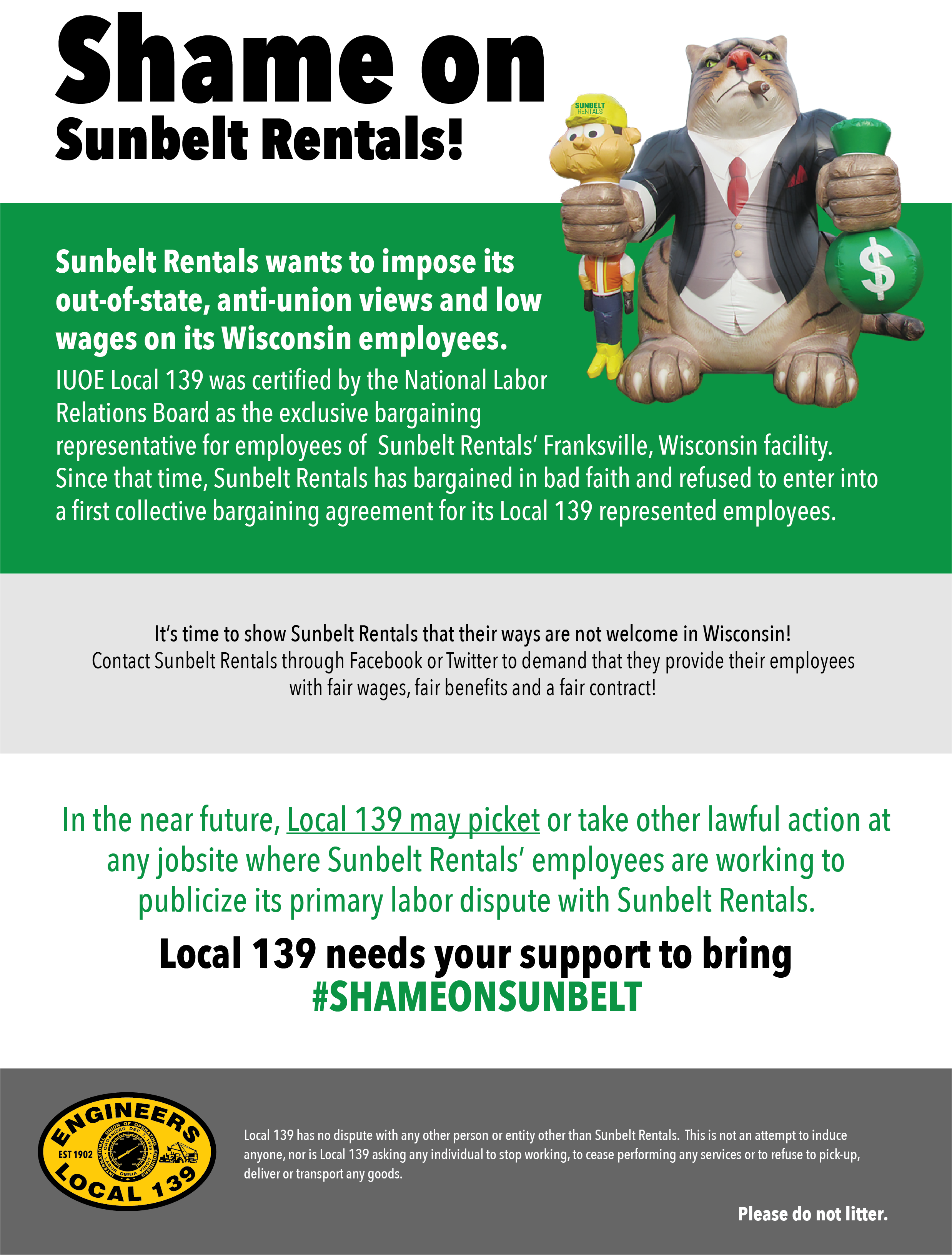 IUOE Local 139 was certified by the National Labor Relations Board as the exclusive bargaining representative for employees of Sunbelt Rentals’ Franksville, Wisconsin facility. Since that time, Sunbelt Rentals has bargained in bad faith and refused to enter into a first collective bargaining agreement for its Local 139 represented employees.